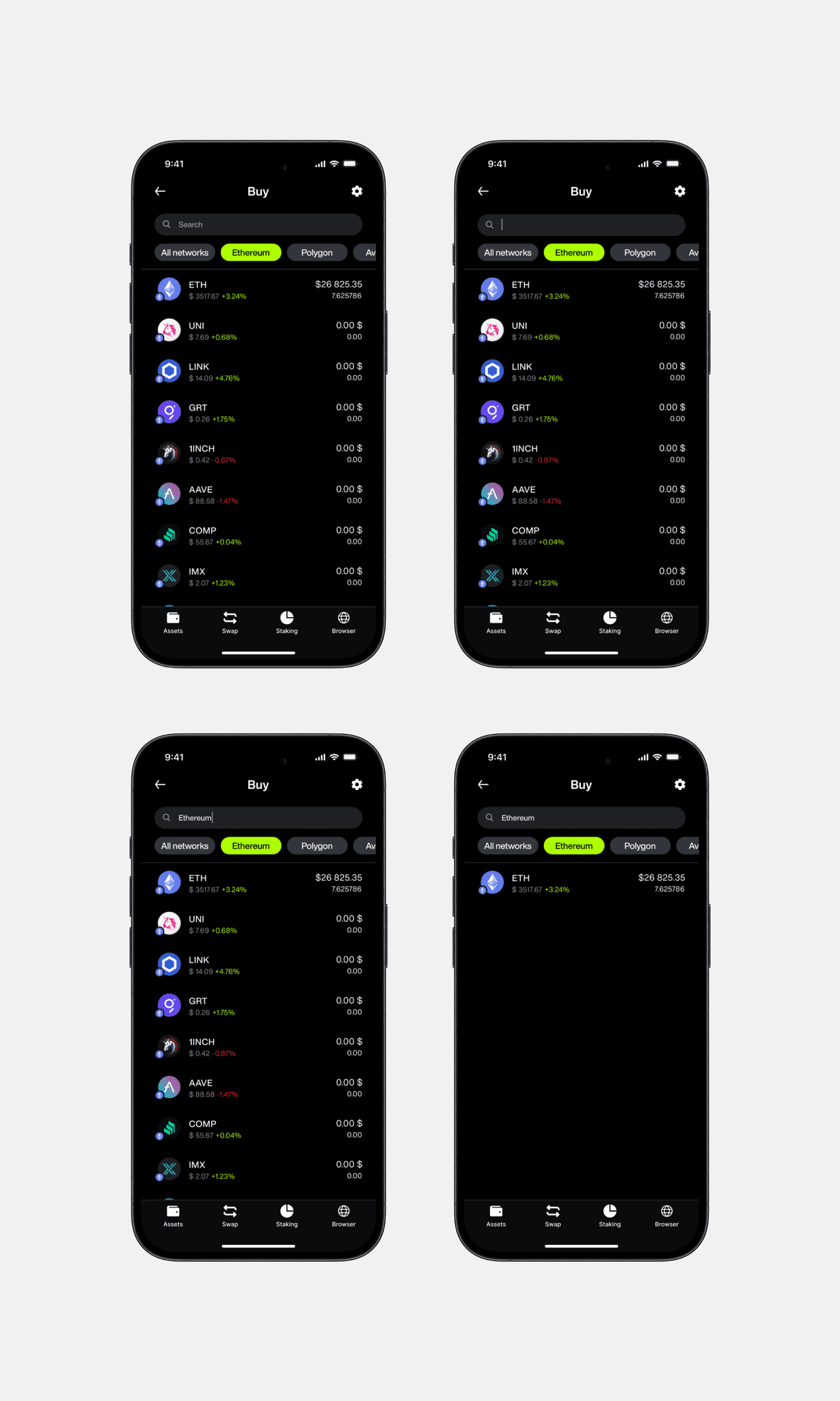 I developed a search that allows users to quickly find the cryptocurrency they need by dividing the networks into categories, allowing users to navigate faster and save their time.