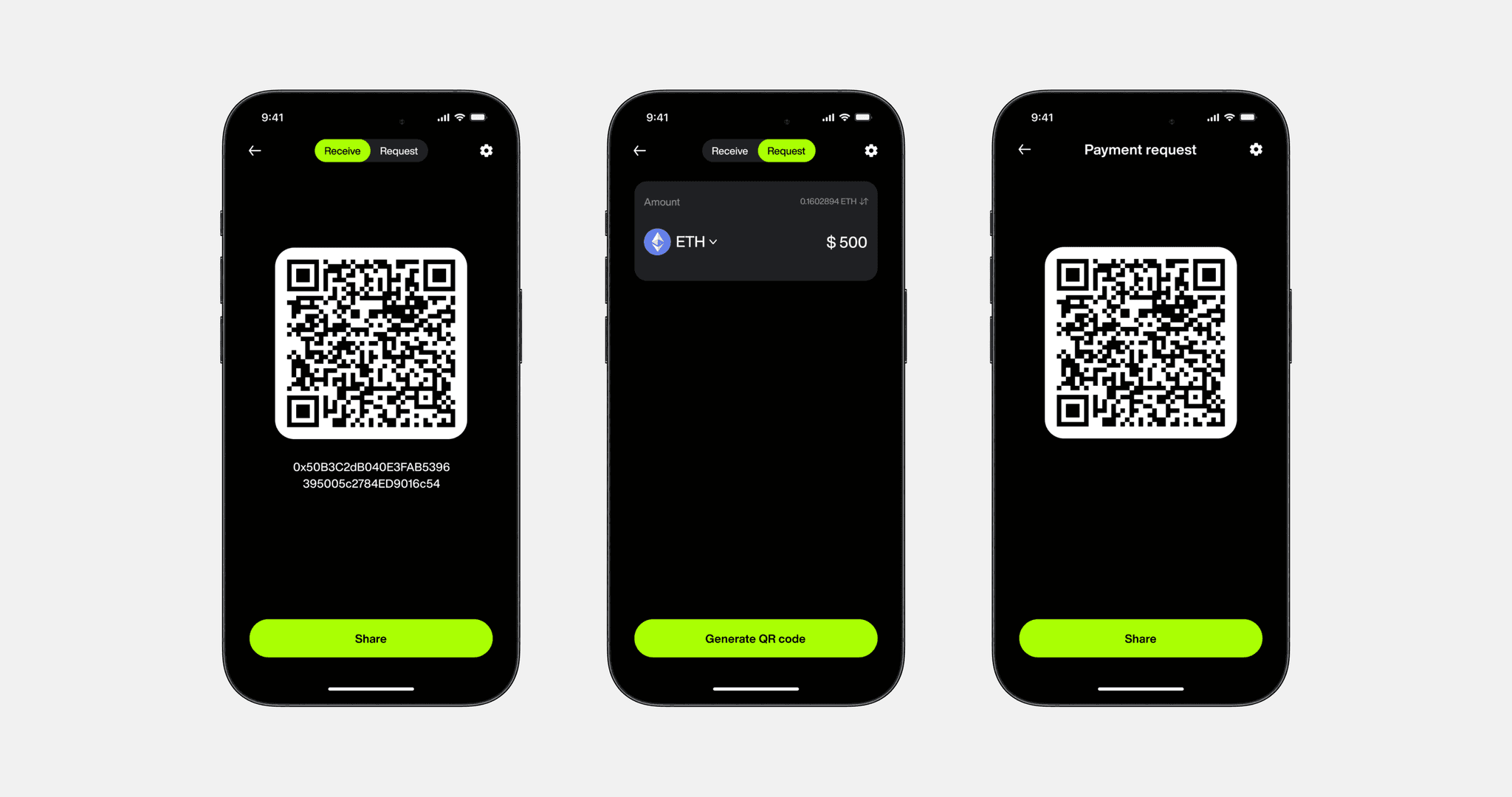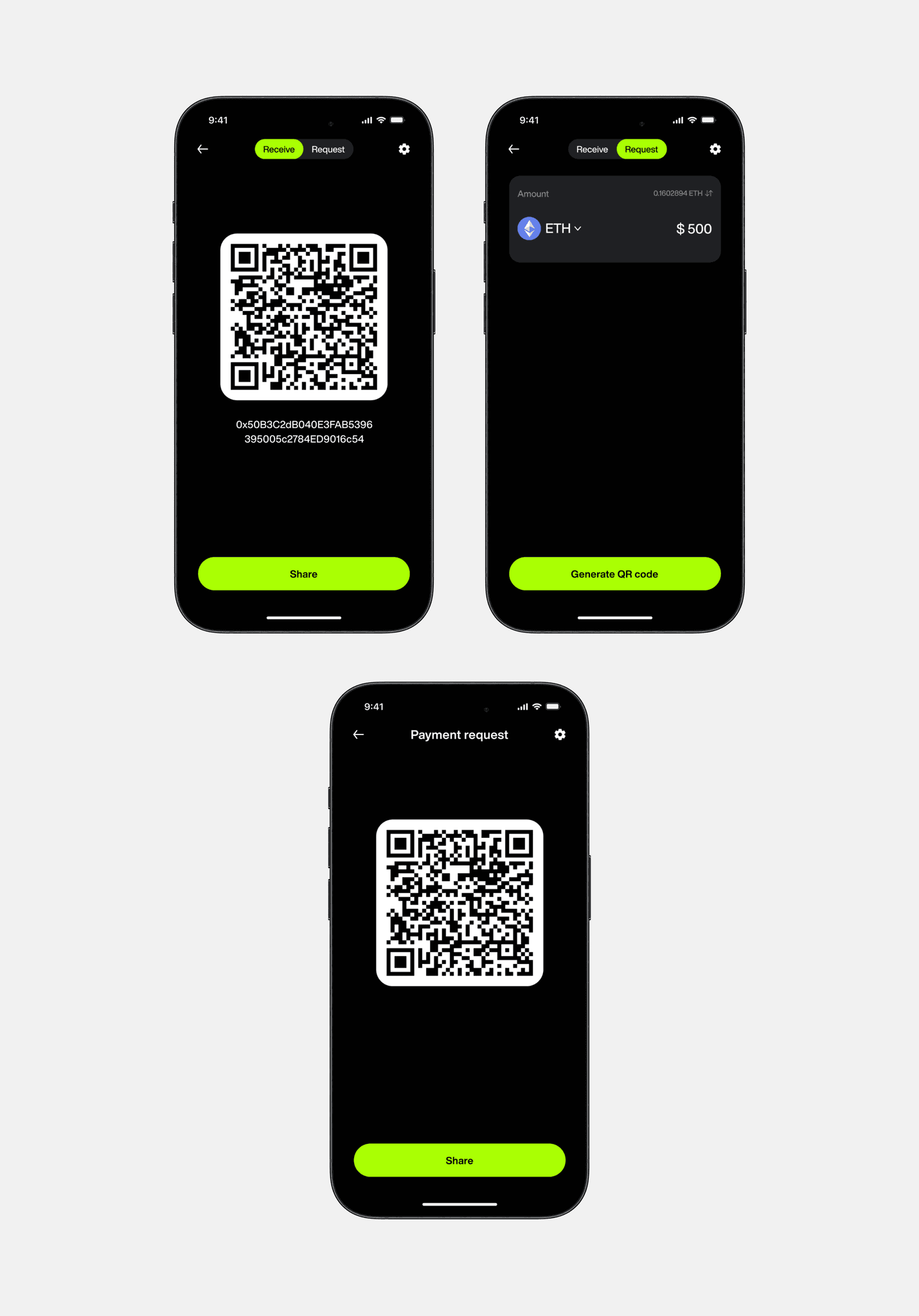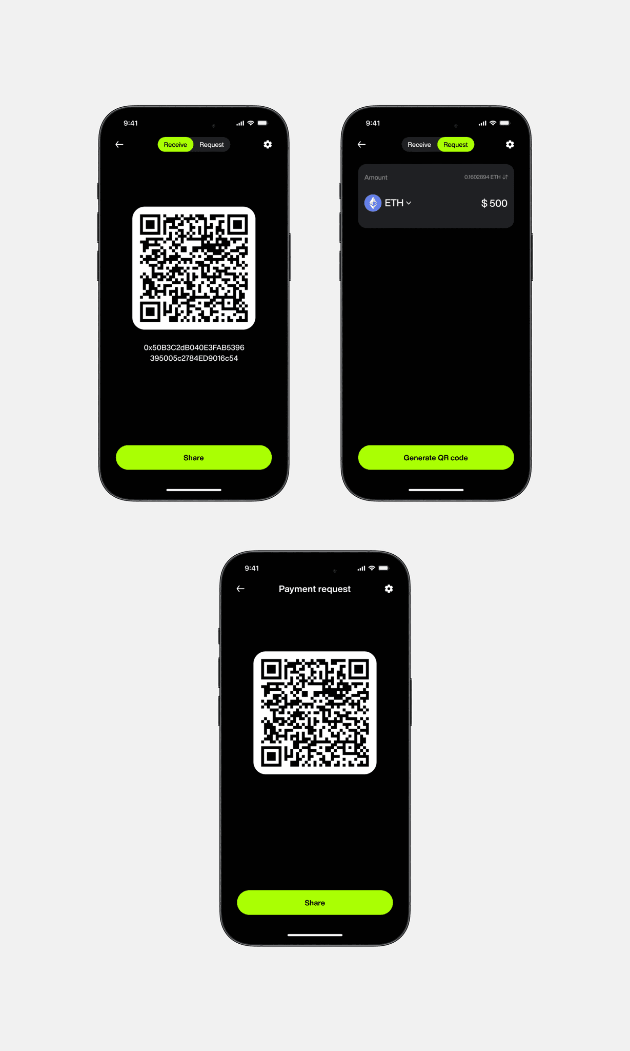 Users first select the amount to transfer in dollars with the option to convert it into the number of coins to send. Once selected, a QR code is automatically generated, which can be shared with the sender. This solution combines currency selection and QR code generation into one convenient flow, which greatly simplifies the process of requesting a payment and makes it more understandable for the user.