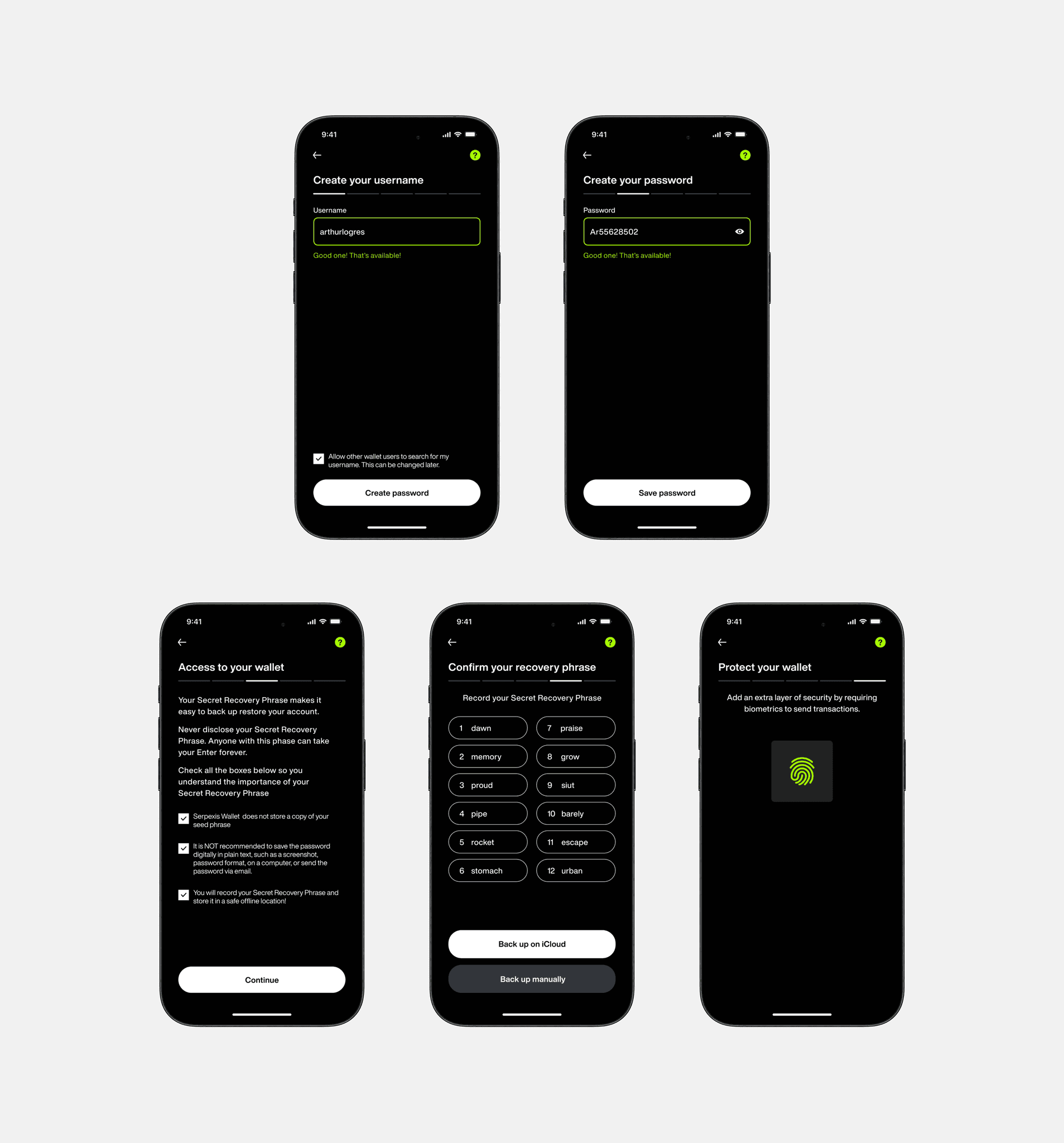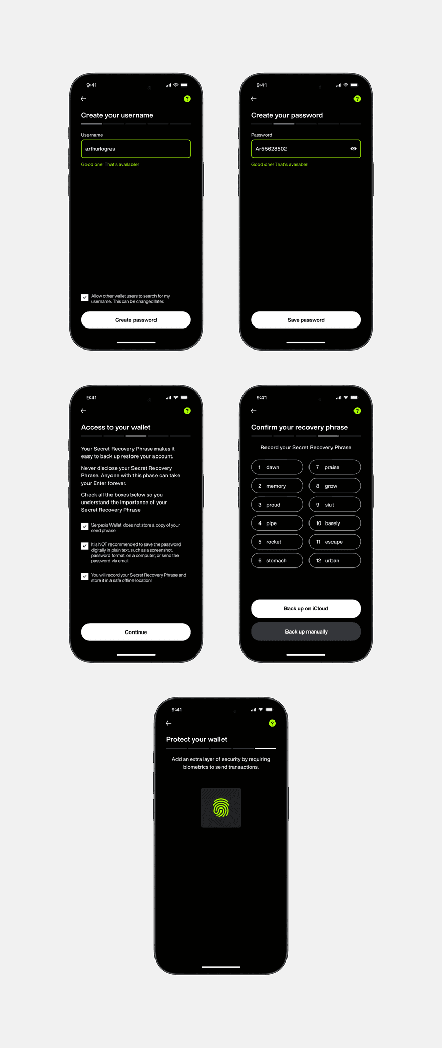 I divided the entire registration into five stages: Creating a username, Creating a password, Confirming the regulations, Generating a seed phrase and Additional security measures, with the development of all error scenarios and additional tips in the upper right corner of the screen to make it structured and understandable for the user