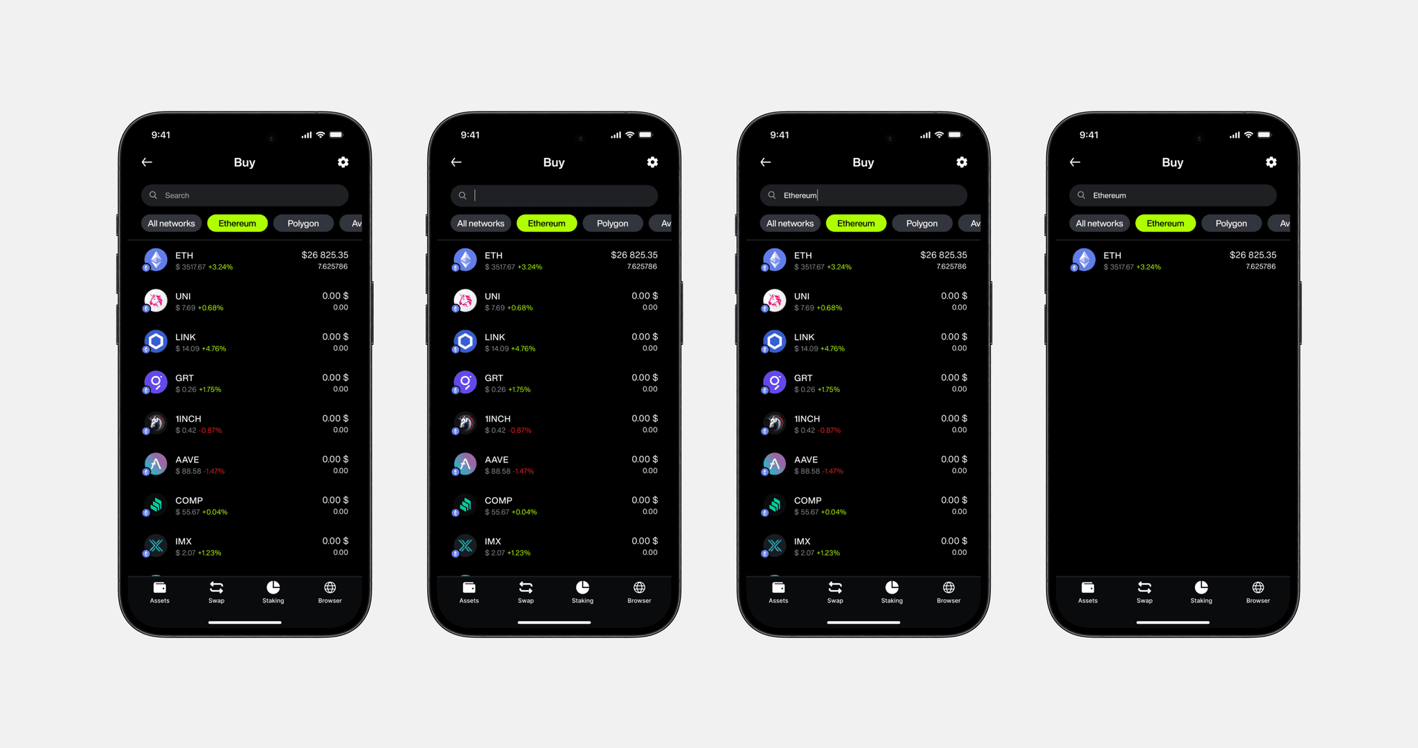 I developed and integrated functionality into our wallet that allows users to easily and naturally interact with these ecosystems. And also moved them all to the first screen of the application, making them tabs so that the user can easily navigate between them, breaking the balance section into additional elements so that the user can quickly navigate through all the additional screens, without wasting extra time searching for them throughout the crypto wallet.